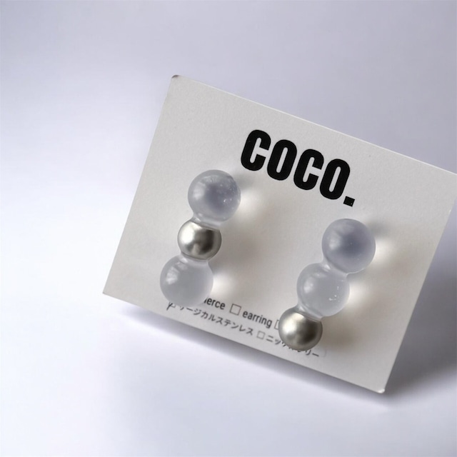「 やわらかな透明感をまとった、マットバブルの耳飾り 」 レジンでひとつひとつ制作した、 ぷっくりと丸みのあるバブルモチーフの耳飾りです。 透明感のあるバブル部分には、 マットコーティングを施し、 光をやわらかく拡散する落ち着いた質感に仕上げました。 異なる素材や質感のパーツを組み合わせることで、 シンプルながらも奥行きのあるデザインに。 主張しすぎない存在感で、 カジュアルからきれいめまで、 幅広いスタイルに自然になじみます。 ………………………………………… □ 基本金具 ( silver ) ピアス : サージカルステンレス ( 下向き防止キャッチ付き ) イヤリング : ネジバネ式 イヤリング ( ニッケルフリー ) ※ 金具変更はオプション選択よりご選択をお願いいたします □ 素材 レジン □ 重さ 片耳 3g □ サイズ 約 3.5cm ………………………………………… ※ 他のカラーはこちらから ・ブラック https://coco0.official.ec/items/132749359 ………………………………………… □ 発送について 発送期間は5日以内を予定しております ………………………………………… □ 注意事項 ご購入前に「 ABOUT 」をお読みください https://coco0.official.ec/about お使いのモニター環境によって、実際の色と画面上の色が異なる場合がございますので ご了承ください ※既製品のような強度はございません。商品の取り扱いには十分ご注意ください ………………………………………… その他質問等がございましたら お気軽にお問合せください ………………………………………… ピアス イヤリング バブル レジン 3連 モノトーン 冬 カジュアル きれいめ