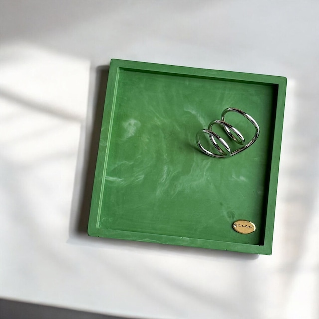 【 SALE |10%OFF 】 「 スクエアフォルムが映える、coco.タグ付きトレイ 」 スクエアデザインに、 coco.のロゴタグを添えたスクエアトレイ。 ジェスモナイト特有のなめらかな質感と、 奥行きを感じるマーブル模様が、 空間に落ち着きと洗練された印象をプラスします。 アクセサリーやリング、鍵などの小物置きとしてはもちろん、 デスクや棚の上に置くだけで、 インテリアのアクセントとしてもお楽しみいただけます。 シンプルながらも存在感があり、 韓国インテリアやモダン、ミニマルな空間にぴったりです。 ………………………………………… □ 素材 ジェスモナイト ※ 表明はコーティング加工を施しており ツヤのある仕上がりです □ 重さ 約 122g □ サイズ 約 10 × 10cm ………………………………………… □ ジェスモナイトとは ジェスモナイトとは樹脂でありながら、従来の一般的な油性樹脂とは質感が異なり、 プラスチック特有のテカリ感がほとんどなく、石のような落ち着いた風合いをもつ素材です。 ※すべてハンドメイドの為、イッテンモノです。 ………………………………………… □ お取り扱いについて ・ 当店で取り扱うジェスモナイトは耐水性がないものですが 一時的に水がかかる分には問題ありません 濡れた場合や汚れた際にはタオルで拭いてください ( 長時間水につけておくと変色の可能性があります ) ・長時間水につけることや食品にはお使いいただけません 何か食べ物を置く場合はペーパー等を敷き 直接触れないようにしてお使いください ・非常に丈夫な素材ではありますが扱い方によっては 割れてしまうこともあります ・ジェスモナイトの性質上気泡が入り 欠けているようにみえるところもありますが 気泡もデザインの一部としてご理解いただけますと幸いです ………………………………………… □ 発送について 発送期間は5日以内を予定しております ………………………………………… □ 注意事項 ご購入前に「 ABOUT 」をお読みください https://coco0.official.ec/about お使いのモニター環境によって、実際の色と画面上の色が異なる場合がございますので ご了承ください ※既製品のような強度はございません。商品の取り扱いには十分ご注意ください ………………………………………… その他質問等がございましたら お気軽にお問合せください ………………………………………… ジェスモナイト ハンドメイド 小物プレート アクセサリートレイ カラフル 雑貨 ギフト ミニマルデザイン 撮影小物 ディスプレイ インテリア雑貨