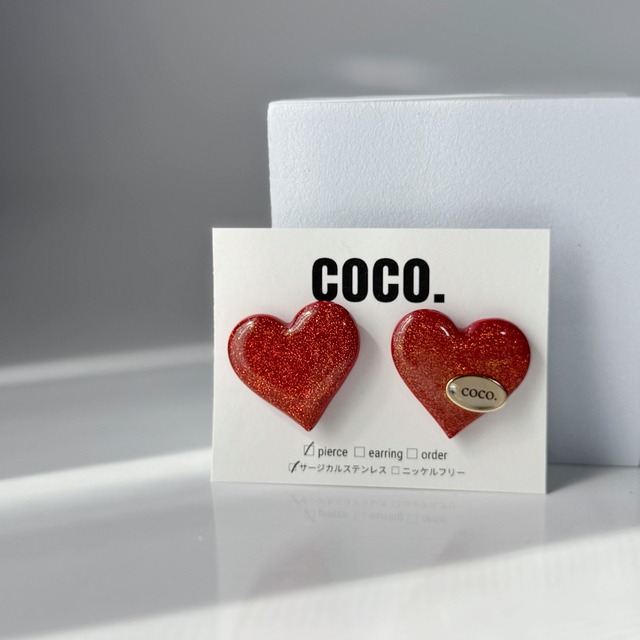 「 ラメがきらめく、ぷっくりハートの耳飾り 」 ポリマークレイで成形したハートモチーフに、 ラメを加えてきらめきをプラス。 さらにレジンでコーティングし、 ぷっくりとした立体感のある仕上がりにしました。 光を受けるたびに、 奥行きのある輝きが耳元を彩ります。 シンプルなコーディネートのアクセントとしてはもちろん、 推しカラーとして取り入れるのもおすすめ。 甘くなりすぎないハートデザインなので、 大人のカジュアルスタイルにも自然になじみます。 ………………………………………… □ 基本金具 ( ゴールド ) ピアス : サージカルステンレス 、樹脂ピアス イヤリング : ニッケルフリー、樹脂イヤリング □ 素材 ポリマークレイ / レジン □ 重さ 片耳 3g □ サイズ 約 2.5cm ………………………………………… ※ 他のカラーはこちらからお願い致します。 ・グリーン https://coco0.official.ec/items/132745899 ・ブラック https://coco0.official.ec/items/132745972 ………………………………………… □ 発送について 発送期間は5日以内を予定しております ………………………………………… □ 注意事項 ご購入前に「 ABOUT 」をお読みください https://coco0.official.ec/about お使いのモニター環境によって、実際の色と画面上の色が異なる場合がございますので ご了承ください ※既製品のような強度はございません。商品の取り扱いには十分ご注意ください ………………………………………… その他質問等がございましたら お気軽にお問合せください ………………………………………… ポリマークレイ レジン ハート ラメ キラキラ 揺れない 大ぶり シンプル カジュアル 樹脂粘土