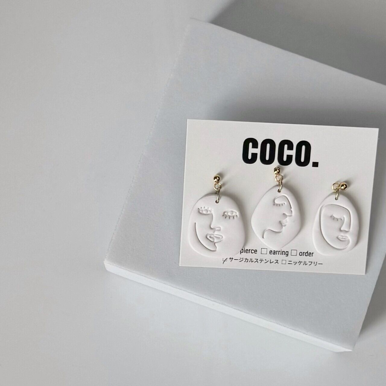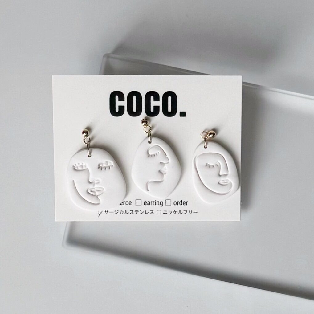 ピアス ぴあす イヤリング いやりんぐ オールシーズン ポリマークレイ ポリマークレイアクセサリー ぽりまーくれい 揺れる ハンドメイド シンプル モダン 顔モチーフ 個性的 ユニークデザイン 3点セット 316L サージカルステンレス アート