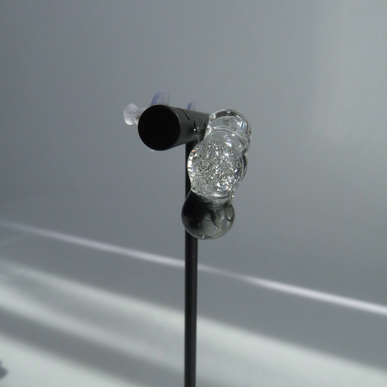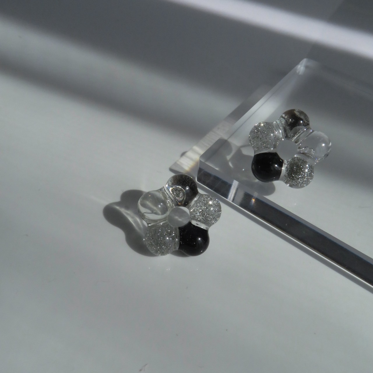 光を受けるたびにレジンの球体が繊細に輝き、上品な印象を与えます。
